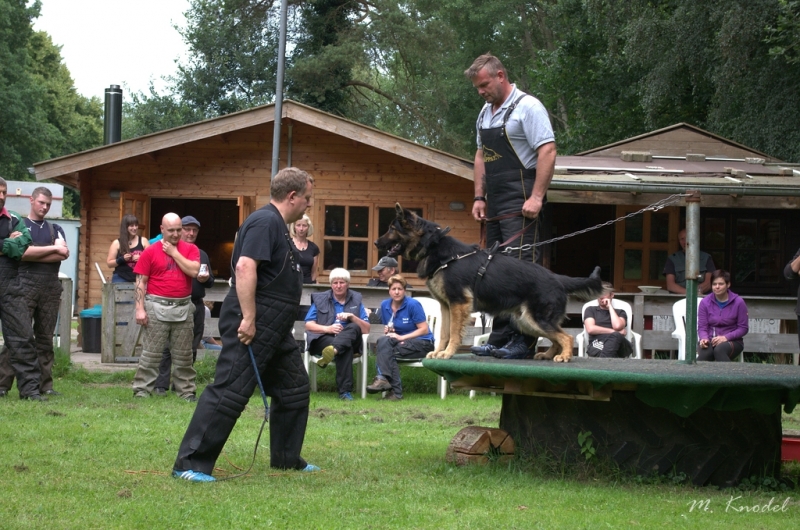 Am 20. Juli 2013 fand die Bremer Stadtmeisterschaft 2013 auf dem Gelände der OG Bremen-Rönnebek statt. Aus unserem Verein starteten Marion Meder mit Grisco von den rauhen Sitten und Michael Hübner mit Aggi von der Schwarzen Meute als Mannschaft. Marion führte Grisco im Schutzdienst IPO 1 vor und erreichte 94 Punkte. Michael startete mit seiner Aggi in der Unterordnung IPO 3 und sicherte sich mit 93 Punkten die zweitbeste Unterordnung des Tages. Mit diesen tollen Ergebnissen schafften es die Vier nicht nur auf das Siegertreppchen, sondern sicherten sich auch den ersten Platz in der Mannschaftswertung. Herzlichen Glückwunsch zu der tollen Leistung!